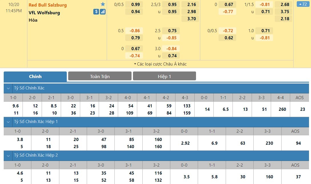 Tỷ lệ kèo cá cược bóng đá trận Red Bull Salzburg vs Wolfsburg