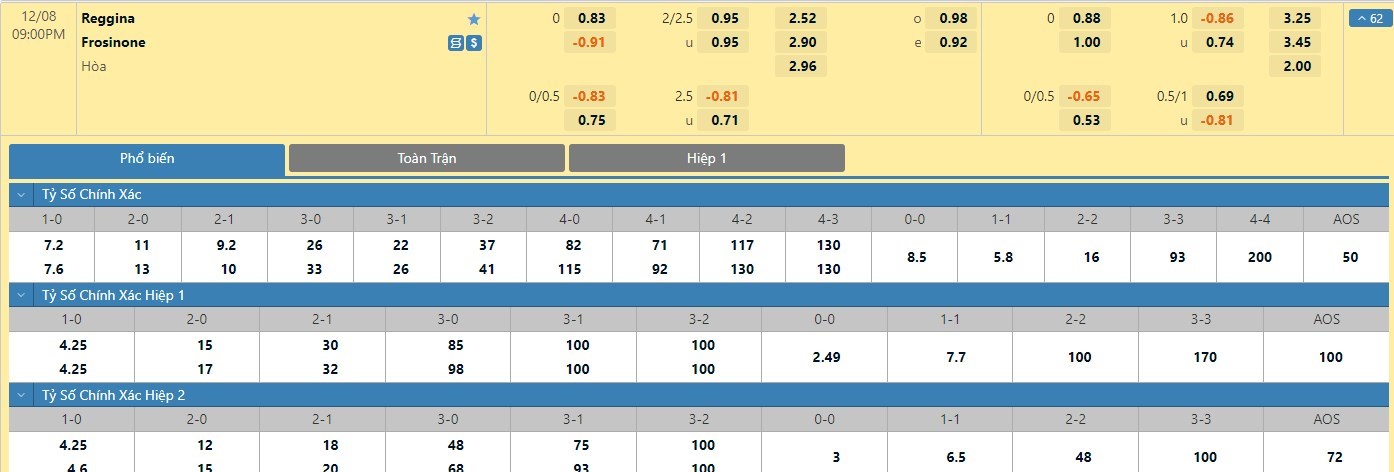 Tỷ lệ kèo cá cược bóng đá trận Reggina vs Frosinone