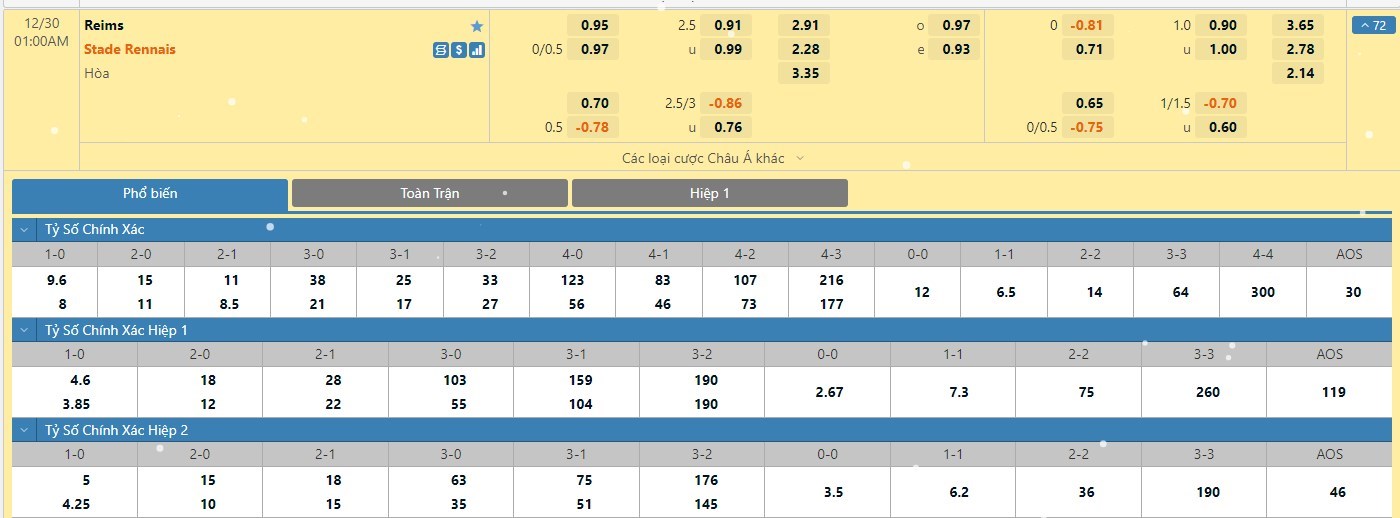 Tỷ lệ kèo cá cược bóng đá trận Reims vs Rennes