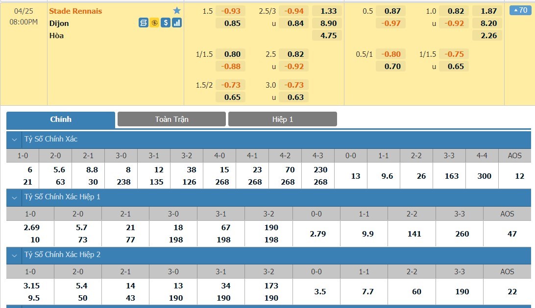 Tỷ lệ kèo cá cược bóng đá trận Rennes vs Dijon