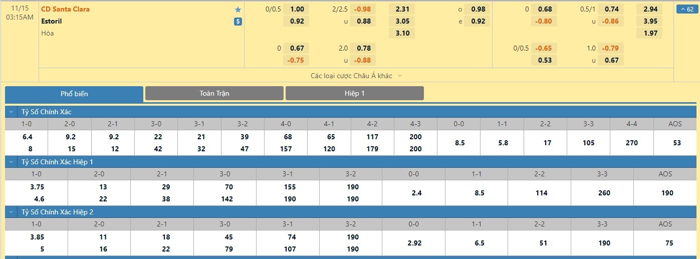 Xem tỷ lệ kèo cá cược bóng đá trực tuyến Santa Clara vs Estoril