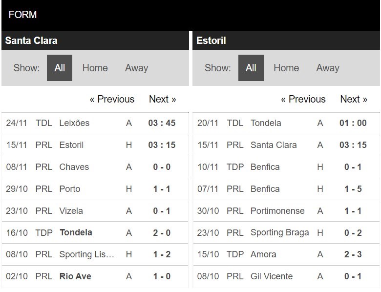 Ở 5 cuộc đối đầu với nhau gần đây nhất, Santa Clara đang là đội bóng có cho mình ưu thế với 2 lần vươn lên dẫn trước, 1 lần bị đối thủ vượt lên và 2 trận đấu kết thúc hiệp 1 với tỷ số bất phân thắng bại. Hàng công của Santa Clara đang thi đấu không tốt với cả 5 trận đấu gần nhất không có bàn thắng ở hiệp 1. Trong khi đó, Estoril cũng tỏ ra bế tắc với 4/5 trận gần nhất không thể khai thông thế bế tắc ở 45 phút đầu tiển.