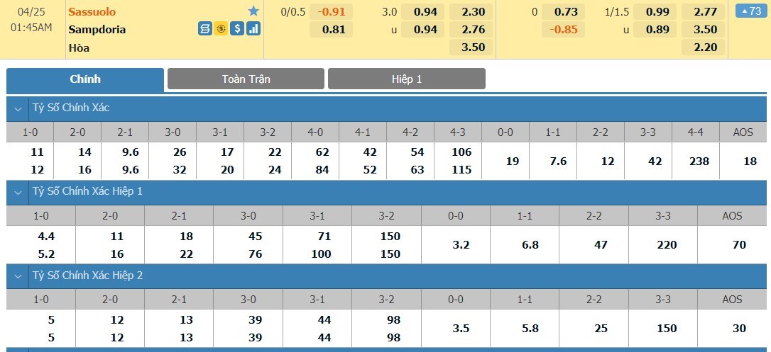 Tỷ lệ kèo cá cược bóng đá trận Sassuolo vs Sampdoria