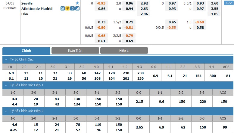 Xem tỉ lệ kèo cá cược bóng đá trực tuyến Sevilla vs Atletico Madrid