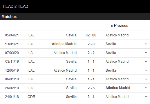 Thống kê đối đầu Sevilla vs Atletico Madrid