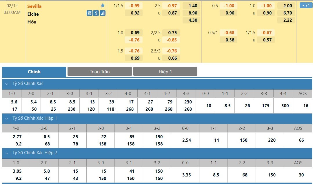 Tỷ lệ kèo cá cược bóng đá trực tuyến trận Sevilla vs Elche