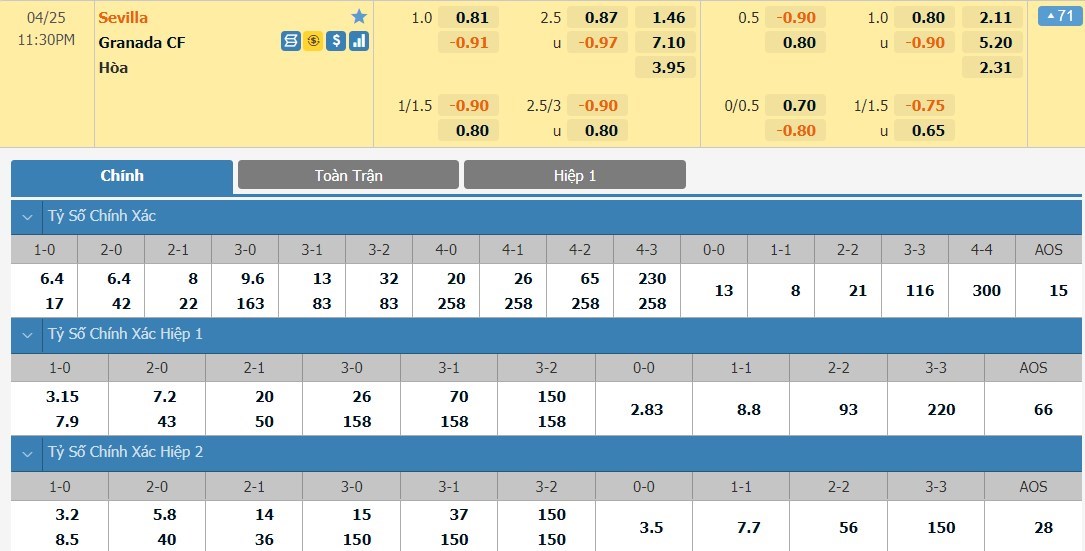 Tỷ lệ kèo cá cược bóng đá trận Sevilla vs Granada