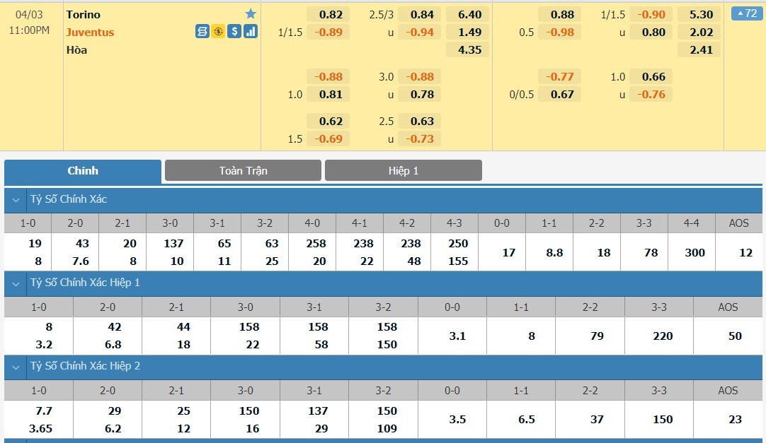 Tỷ lệ kèo cá cược bóng đá trận Torino vs Juventus