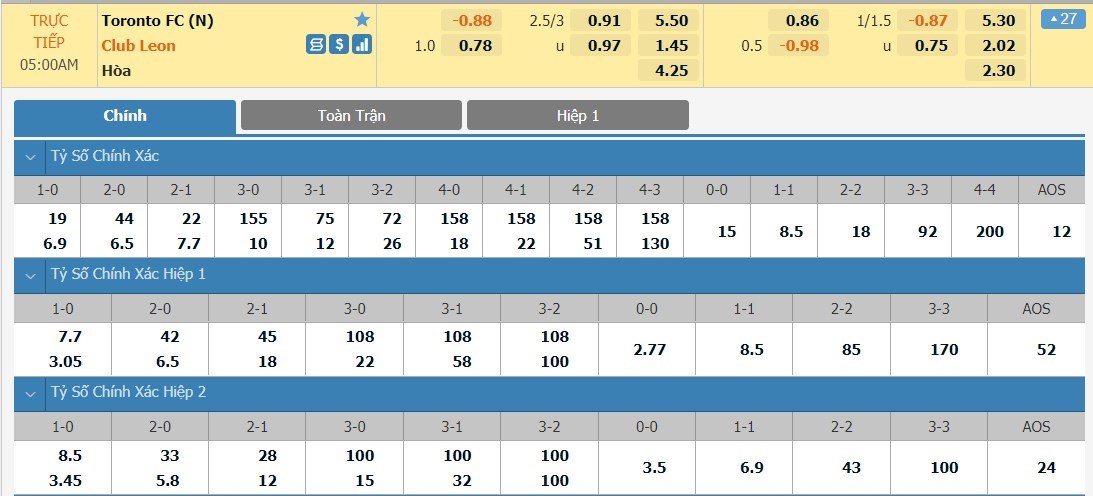 Tỷ lệ kèo cá cược bóng đá trận Toronto FC vs Leon