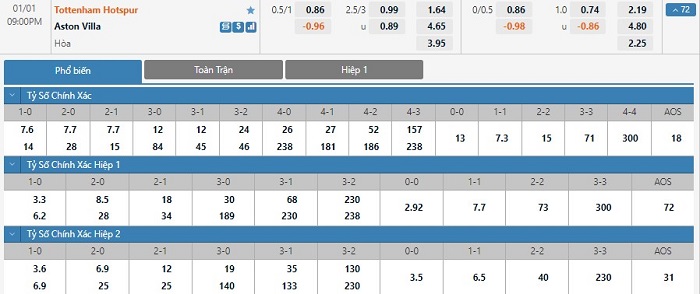 Chu kỳ lên xuống tỷ lệ kèo Tottenham vs Aston Villa