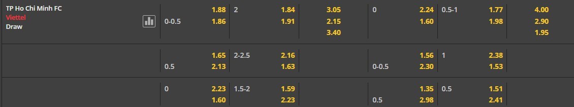 Tỷ lệ kèo cá cược bóng đá trận TP Hồ Chí Minh vs Viettel