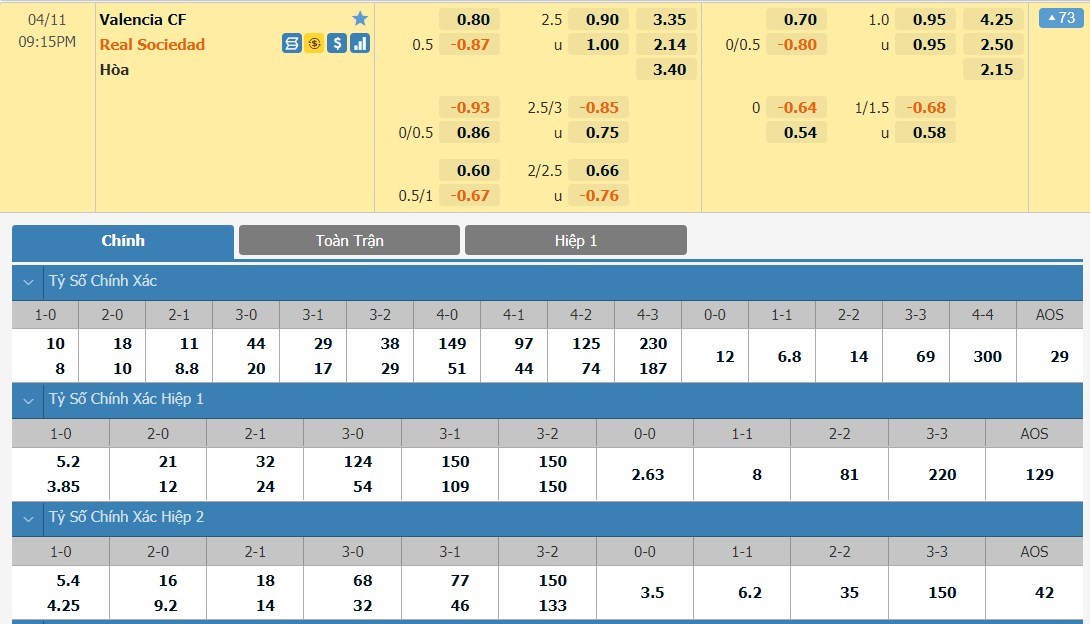 Tỷ lệ kèo cá cược bóng đá trực tuyến trận Valencia vs Real Sociedad