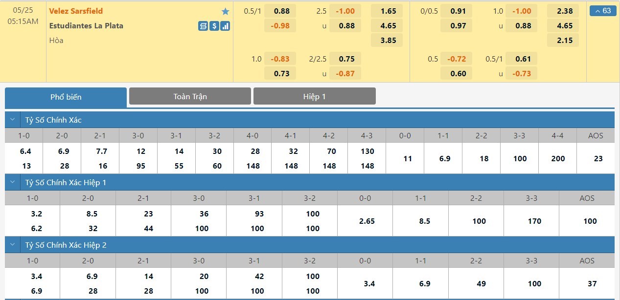 Xem tỷ lệ kèo cá cược bóng đá trực tuyến Velez Sarsfield vs Estudiantes