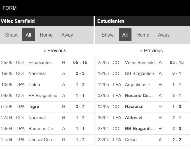 Thống kê phong độ Velez Sarsfield vs Estudiantes