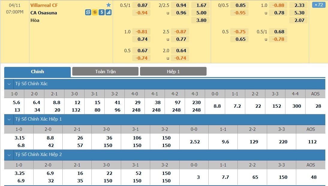 Tỷ lệ kèo cá cược bóng đá trực tuyến trận Villarreal vs Osasuna