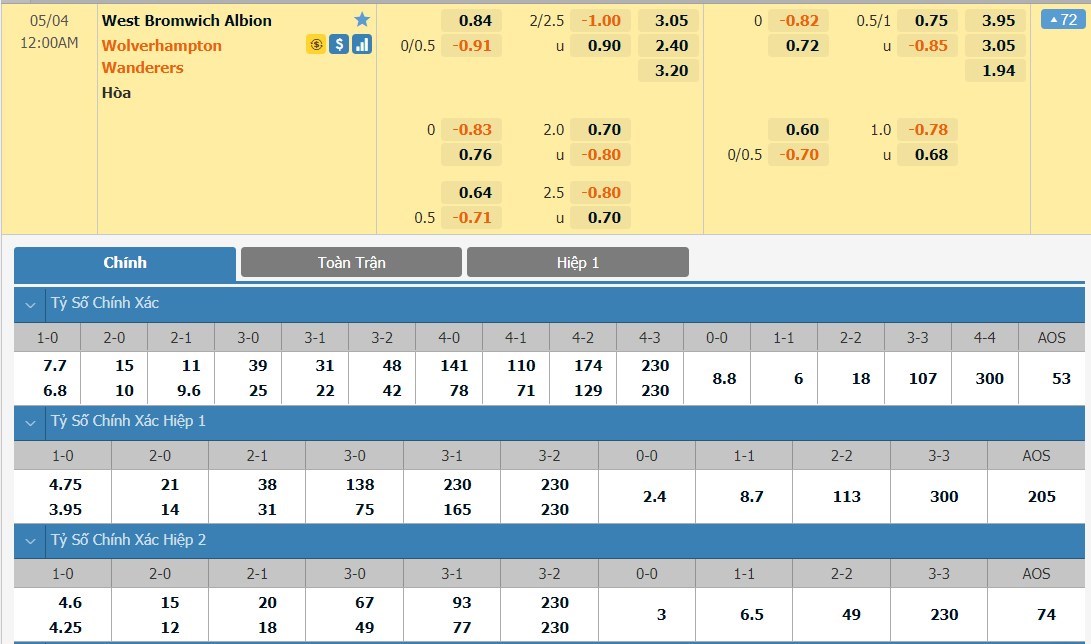 Tỷ lệ kèo cá cược bóng đá trực tuyến trận West Bromwich vs Wolverhampton
