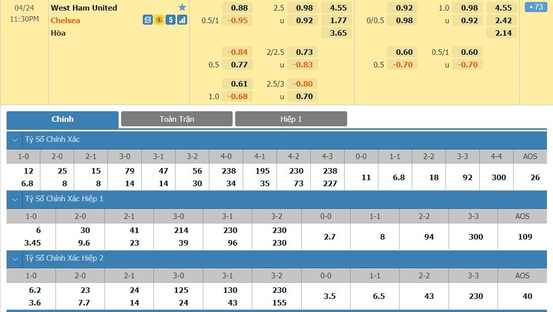 Tỷ lệ kèo cá cược bóng đá trực tuyến trận West Ham vs Chelsea