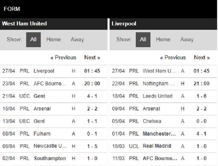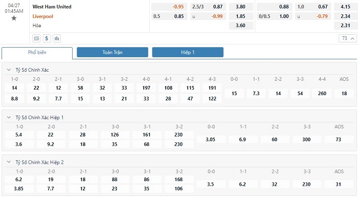 Chu kỳ lên xuống tỷ lệ kèo West Ham vs Liverpool