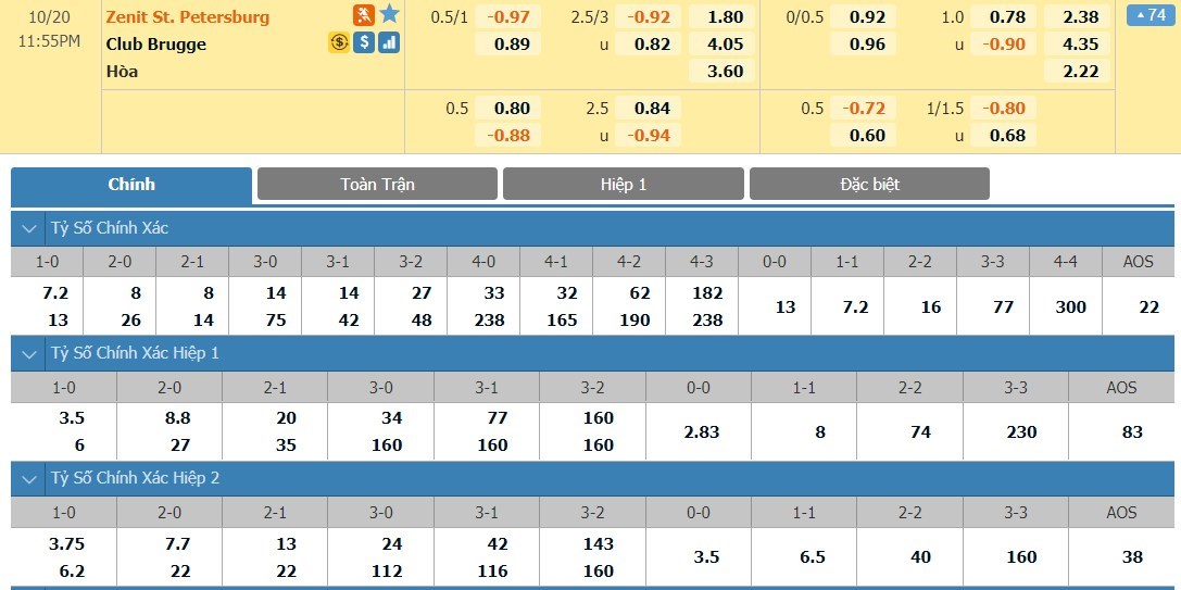 Xem tỷ lệ kèo cá cược bóng đá trực tuyến Zenit St. Petersburg vs Club Brugge