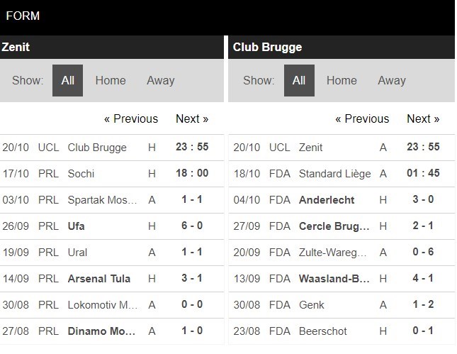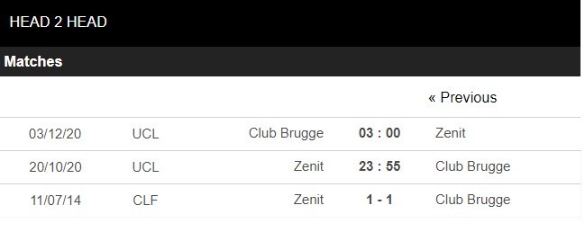 Thống kê đối đầu Zenit St. Petersburg vs Club Brugge
